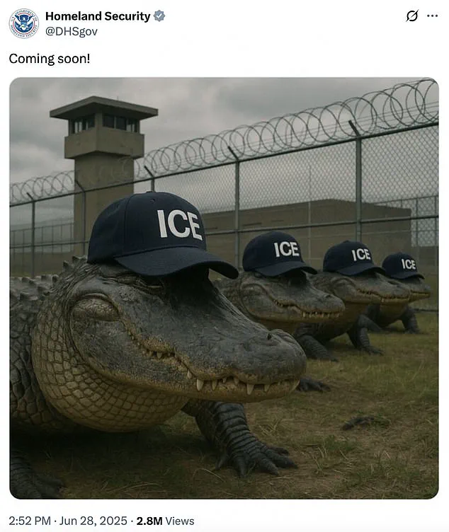 The Department of Homeland Security stoked fear with an AI-generated meme showing snarling alligators in ICE baseball caps patrolling the swampy grounds of the future facility dubbed ‘Alligator Alcatraz.’ The image, released as part of a broader campaign to highlight the ‘threat’ posed by undocumented migrants, drew immediate backlash from environmentalists and Native American leaders, who decried the facility as a symbol of both ecological recklessness and cultural insensitivity.