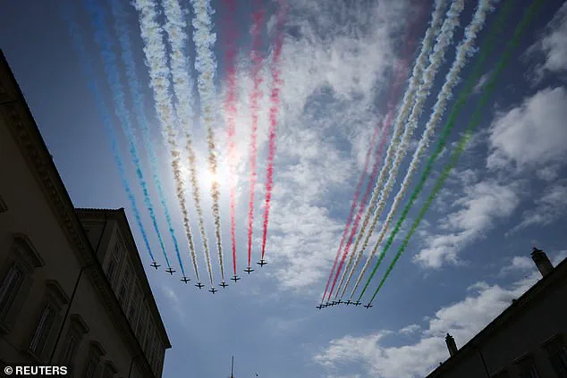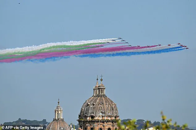 The Frecce Tricolori released red, white, and green smoke — Italy’s national colors — while the Red Arrows emitted red, white, and blue smoke, creating a vivid tableau against the backdrop of Rome’s architectural splendor.