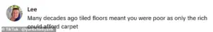 A TikToker provided a brief history lesson, explaining that decades ago, tiled floors were a sign of poverty, as only the wealthy could afford carpets.