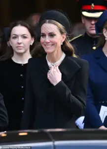 The Princess of Wales, dressed in all black, wore the same ensemble she had donned for the late Prince Philip’s funeral, a deliberate nod to continuity and respect.