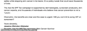 Jessica implores the Chancellor during Skin Cancer Awareness Month to abolish the ‘luxury’ tax on sunscreen.