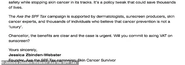 ‘Britain’s rising skin cancer rates are indicative of a public health crisis,’ Jessica declares. ‘It’s illogical to tackle this issue by imposing a luxury tax on the very products that prevent it.’