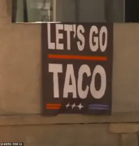 The property, captured in footage by the targeted outlet, bore two anti-Trump flags: ‘Let’s go taco,’ a reference to the political meme TACO (Trump Always Chickens Out), and ‘Is he dead yet?’ — a phrase that directly references President Donald Trump.