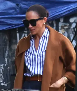 The Duchess of Sussex, clad in wide-leg navy trousers, a striped blouse, and a brown coat, exuded an air of effortless sophistication as she entered the members-only club in Manhattan’s Meatpacking District.