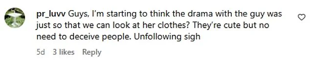 Fans who had believed in the love story were left reeling, feeling deceived by what they had perceived as a genuine connection. ‘Guys, I’m starting to think the drama with the guy was just so that we can look at her clothes?’ one follower wrote, their frustration evident. ‘They’re cute but no need to deceive people.
