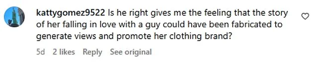 One commenter described the tale as a ‘made-up story that hurts many people who already went through such a painful situation,’ while another questioned whether the romance was ‘fabricated to generate views and promote her clothing brand.’ The accusations are not isolated.