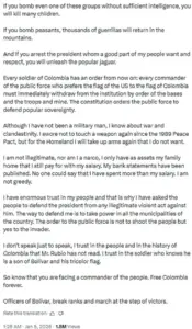 He further warned that attacking a president whom many Colombians ‘want and respect’ would ‘unleash the popular jaguar,’ a metaphor for widespread popular resistance and backlash.