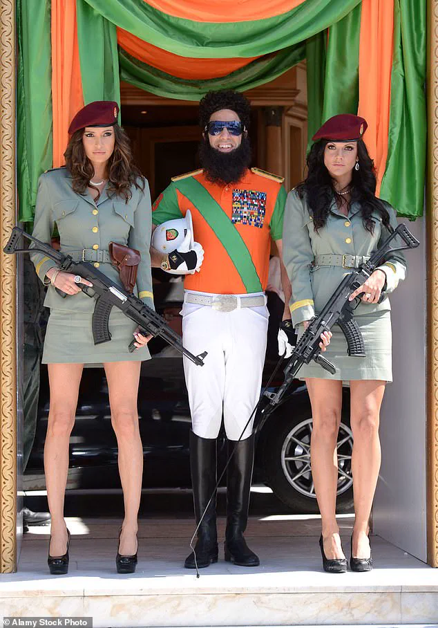 Dressed in a red beret and khaki jacket, she posed as one of the ‘virgin guards’ accompanying Baron Cohen’s character through Cannes, a moment that now feels tragically ironic.