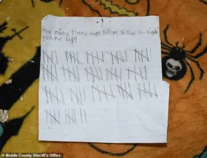 A 14-year-old girl in Alabama spent nearly a year living in squalor within a dilapidated mobile home, her only record of her mother’s repeated failures to rescue her a chilling letter filled with 87 tally marks.