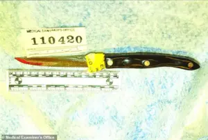 A 10-inch knife was found embedded in her chest, dangerously close to her heart.