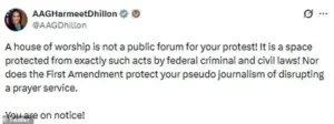 Dhillon took to social media on Monday to address the controversy, emphasizing that a house of worship is not a public forum for protest.