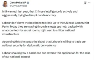 His concerns are shared by groups like the Inter-Parliamentary Alliance on China, which has called the planning approval ‘the wrong decision for the UK.’ Luke de Pulford, a co-founder of the alliance, accused the government of adopting a policy of ‘cover-up, cave in, and cash out,’ arguing that the decision sends a dangerous signal to both dissidents and foreign adversaries.
