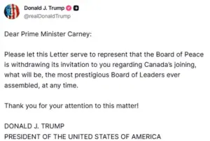 Donald Trump has disinvited Canadian Prime Minister Mark Carney from his Board of Peace, a move that has sparked a diplomatic rift between the two leaders.