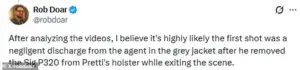 In a post on X, Dobar theorized that the Sig Sauer P320 was removed from Pretti’s holster by an agent in a grey jacket, who then may have experienced a negligent discharge.