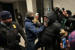 At least two individuals were escorted into custody by federal agents, while one officer appeared to be bleeding from his face, according to The New York Post.