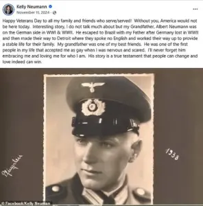 The post, which included images of her late grandfather, Albert Neumann, depicted him in Nazi regalia, including what appeared to be an officer’s uniform.