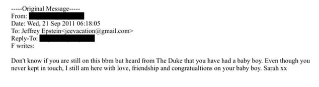 The documents paint a picture of a man who, despite his notoriety, found in Shuliak a rare form of emotional connection. Epstein’s handwritten notes in the files describe a 33-carat diamond ring, ‘flanked by baguette-cut diamonds mounted in platinum,’ as an engagement band. He wrote that he had given it to Shuliak ‘in contemplation of marriage,’ a detail that has fueled speculation about the nature of their relationship. While no child was mentioned in Epstein’s will—his brother Mark denied such claims—there are whispers of a possible offspring, hinted at in a message from Sarah Ferguson, the former Duchess of York, who congratulated Epstein on ‘a baby boy.’ Whether this was a fabrication or a genuine secret remains unclear, but the implications for Shuliak’s life and the broader narrative of Epstein’s legacy are profound.