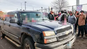 Amid the turmoil, a man driving a dark blue pick-up truck was at the center of the chaos. His vehicle bore a banner reading *’NUREMBERG 2.0’*—a provocative reference to the post-World War II trials of Nazi officials. The driver’s attempts to de-escalate the situation were drowned out by the cacophony of jeers and projectiles. ‘Do you see my f*cking sign?’ he screamed, his voice barely audible over the din. The term *’Nuremberg’* itself, a symbol of justice and accountability, was invoked in a context that begged another question: *Was the protester’s gesture an act of solidarity, or a misguided provocation?*