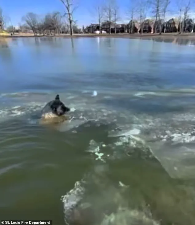 Louis Fire Department later detailed the harrowing sequence of events in a Facebook post, describing how the dog had wandered onto the ice and found itself in a life-threatening situation. 'The ice gave way, leaving the dog trapped in frigid water, unable to swim to safety as the cold quickly took its toll,' the department wrote.