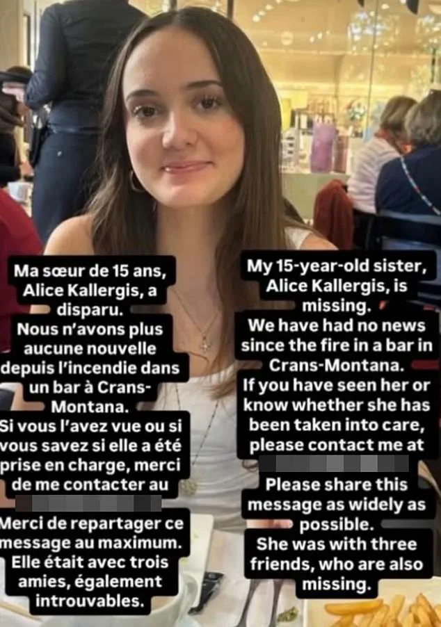 Alice Kallergis, a 15-year-old Greek national, has been missing since the Swiss fire.