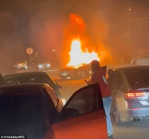 Flames licked at the asphalt as firefighters scrambled to contain the inferno, their efforts hampered by the growing crowd of onlookers and the sheer audacity of the scene unfolding before them.