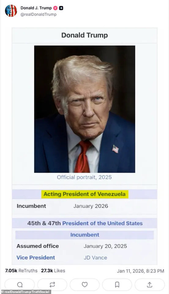 Over the weekend, the US president posted on Truth Social a doctored image of a Wikipedia page showing that he is the 'Acting President of Venezuela.' Trump's actual page on the site carries no such title, and the image he posted appears to be in jest.